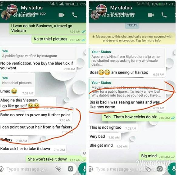 Former Big Brother Naija housemate, Nina has been trying to venture into business of fashion and she was called out by an aggrieved lady for stealing her hail collection photos.