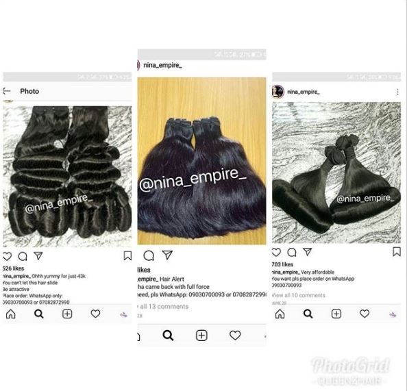 My integrity is all i have going for me in my business .I can’t have my clients asking me if Nina @nina_empire_ is my supplier?I won’t keep Calm and watch a “celeb” rubbish my brand i have been building for years with my blood sweat and tears. She takes pictures from pages of different hair vendors to pass off as hers without giving them credit and even boldly writes “Ninas empire” pictures of hairs she didn’t snap not got from her supplier or factory. She is very unrepentant despite having been called out by @tseju_hair1 on @distinctvendors because she feels she can get away with it.