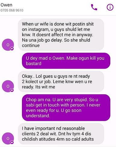“So Owen decides to send my husband this message just now. Well done. We will see how this will end. @owen_imagery just see how you’re using your own hand to ruin ur life and career.”