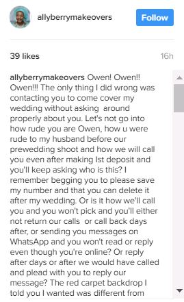 “Owen! Owen!! Owen!!! The only thing I did wrong was contacting you to come cover my wedding without asking around properly about you. Let’s not go into how rude you are Owen, how u were rude to my husband before our prewedding shoot and how we will call you even after making Ist deposit and you’ll keep asking who is this? I remember begging you to please save my number and that you can delete it after my wedding. Or is it how we’ll call you and you won’t pick and you’ll either not return our calls or call back days after, or sending you messages on WhatsApp and you won’t read or reply even though you’re online? Or reply after days or after we would have called and plead with you to reply our message? The red carpet backdrop I told you I wanted was different from what you did, you just did what you liked and sent it.