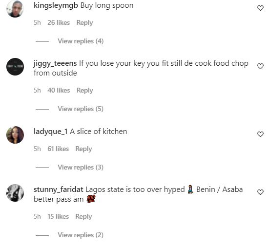 An Instagram user @jiggy_teeens wrote, “If you lose your key you fit still de cook food chop from outside”.