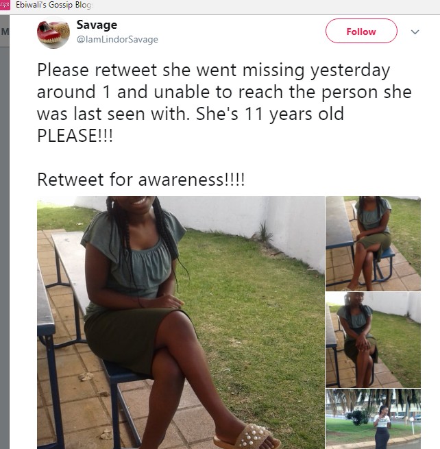 According to her sister, an eleven year old Girl has gone missing and her sister shared the news on her Twitter page, raising awareness for anyone with useful info.