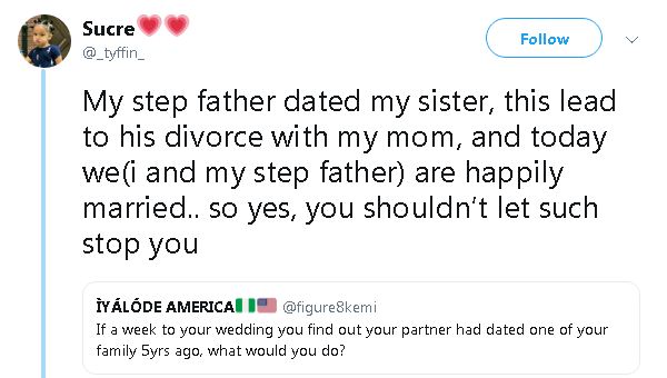 If a week to your wedding you find out your partner had dated one of your family 5yrs ago, what would you do?