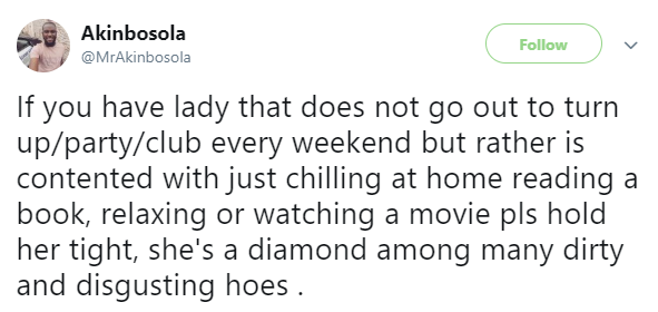 @MrAkinbosola took to the platform to share how he feels that ladies who do not go clubbing every weekend but rather stay back at their houses to engage in simple weekend leisure activities, are diamonds.