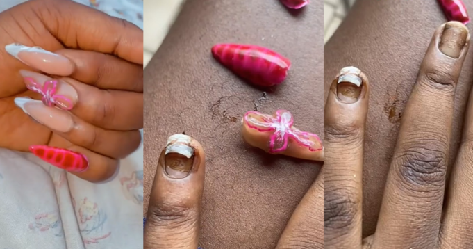 A lady forcefully removed her artificial nails, alleging that the nail technician used a strong adhesive, jokingly referred to as “iron gum.”