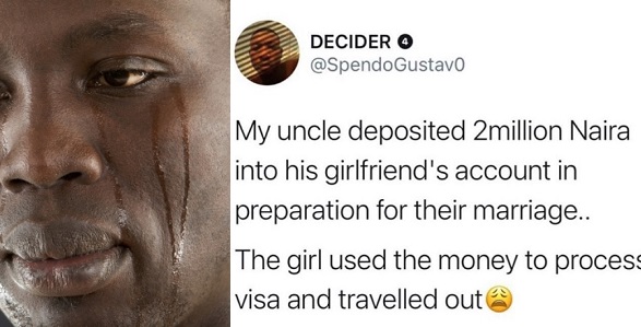 A Nigerian man has taken to Twitter to narrate how his uncle’s fiancé fled with the N2million deposited in her account to plan their wedding.