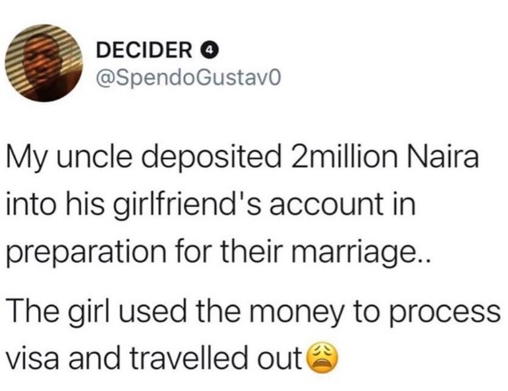 “My uncle deposited N2million into his girlfriend’s account in preparation for their marriage. The girl used the same money to process Visa and travelled out”.