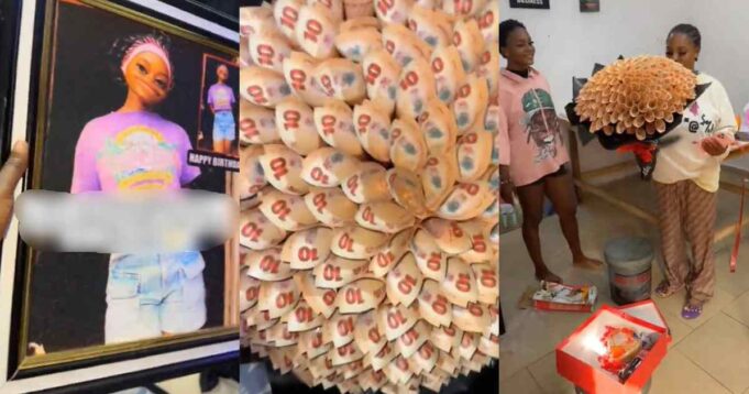 A lady creatively retaliated with an unconventional birthday gift consisting of a bouquet of ₦10 notes, a gift box of soda, and bread in a humorous response to receiving a funny picture frame on her birthday.
