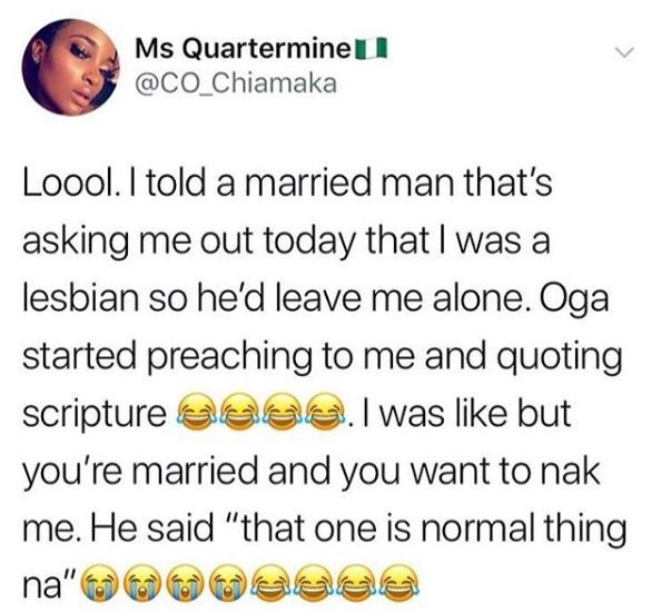 Well, this lady on Twitter decided to switch things up her own style and it’s really hilarious – she claims that it was actually a married man who tried to woo her and after saying what she felt she needed to dismiss him, his reaction is quite surprising.