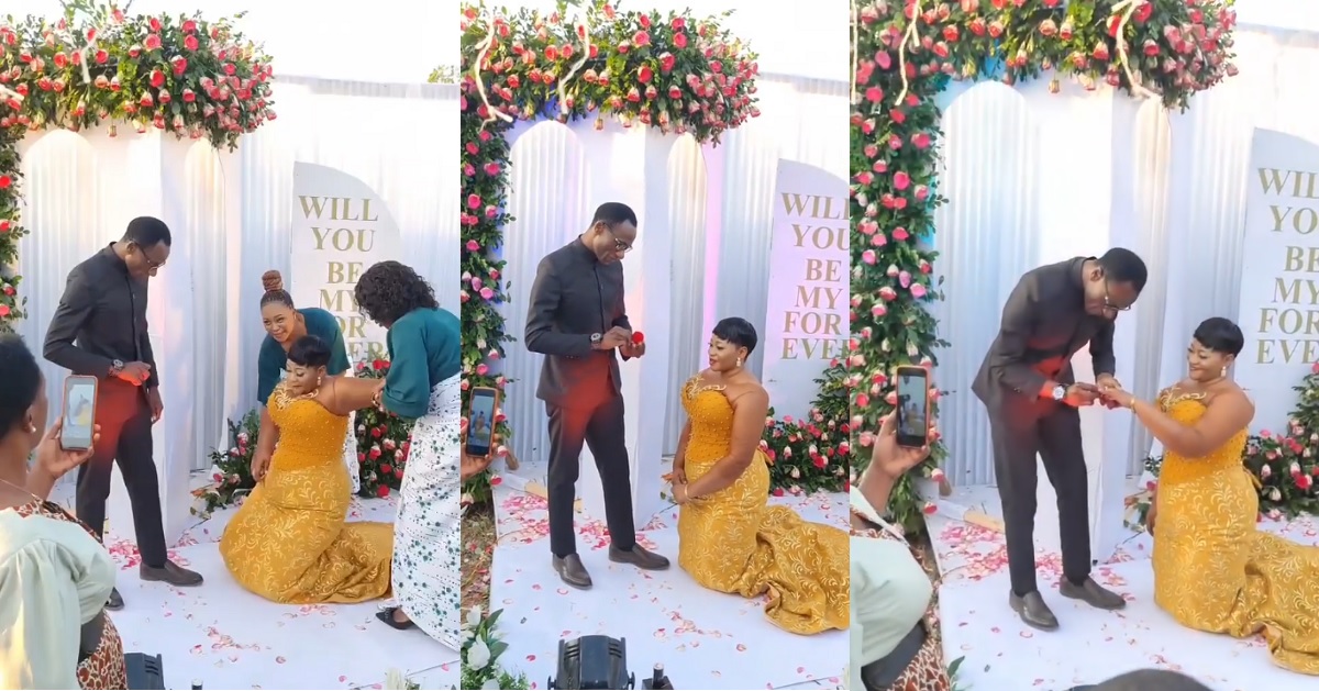 In the video shared on social media, the lady could not control her excitement as her man flaunted the engagement ring he got for her and the energy caused her to go on her knees as the man proceeded to slip it in her finger.