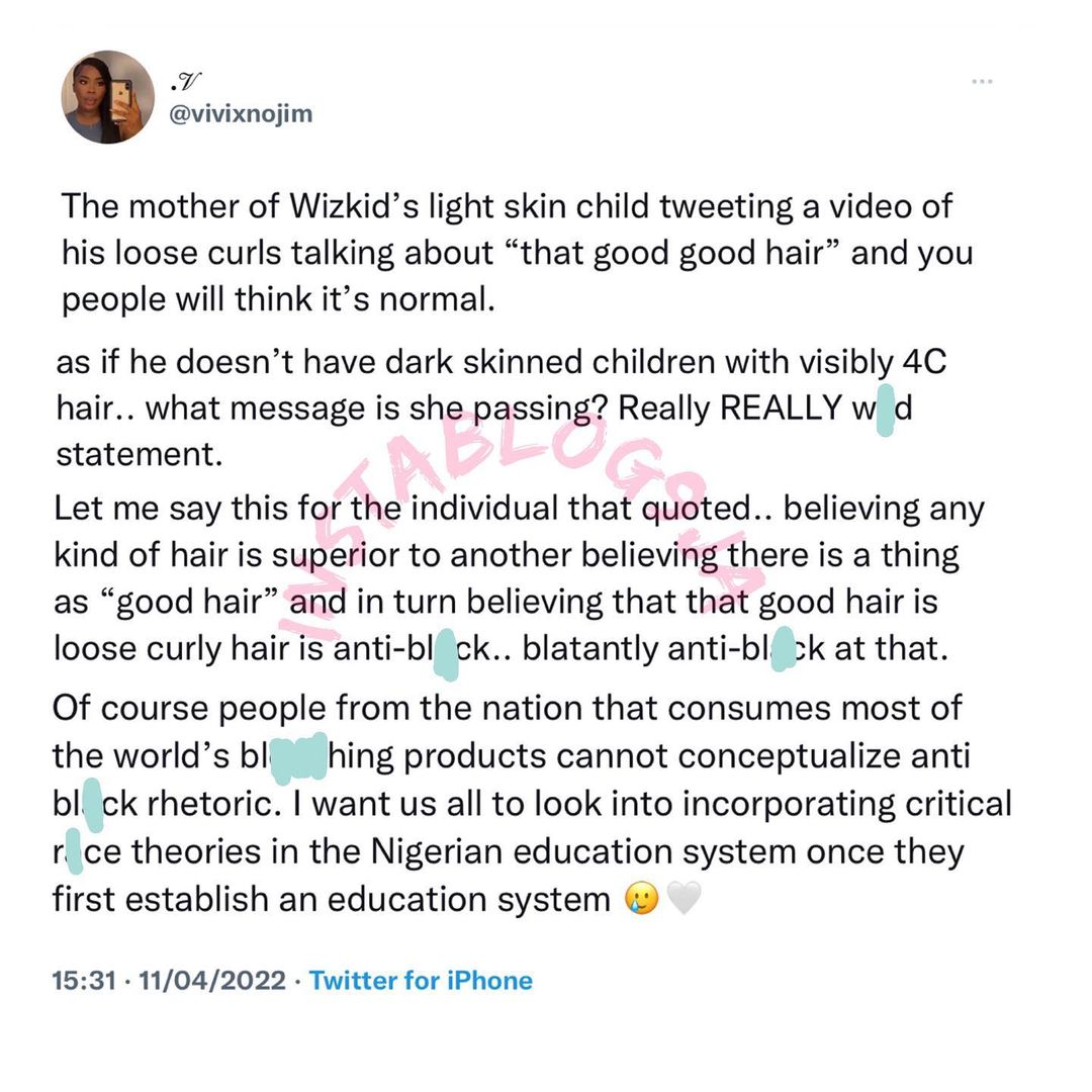 The lady with handle @vivixnojim also criticized the 38-year-old baby mama for indirectly throwing a shade at Wizkid’s other children with Nigerian baby mamas who have normal 4c hair.