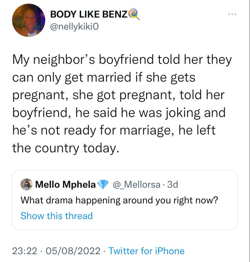 “My neighbor’s boyfriend told her they can only get married if she gets pregnant, she got pregnant, told her boyfriend, he said he was joking and he’s not ready for marriage, he left the country today.”