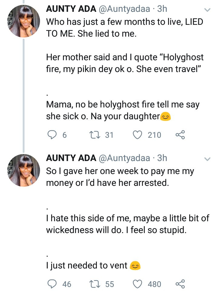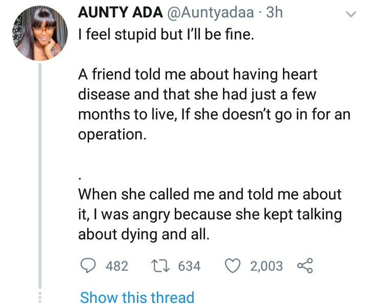 A Nigerian lady popularly known as Aunty Ada on Twitter has taken to the platform to narrate how her best friend duped her of one million naira by lying she was dying of a heart disease.