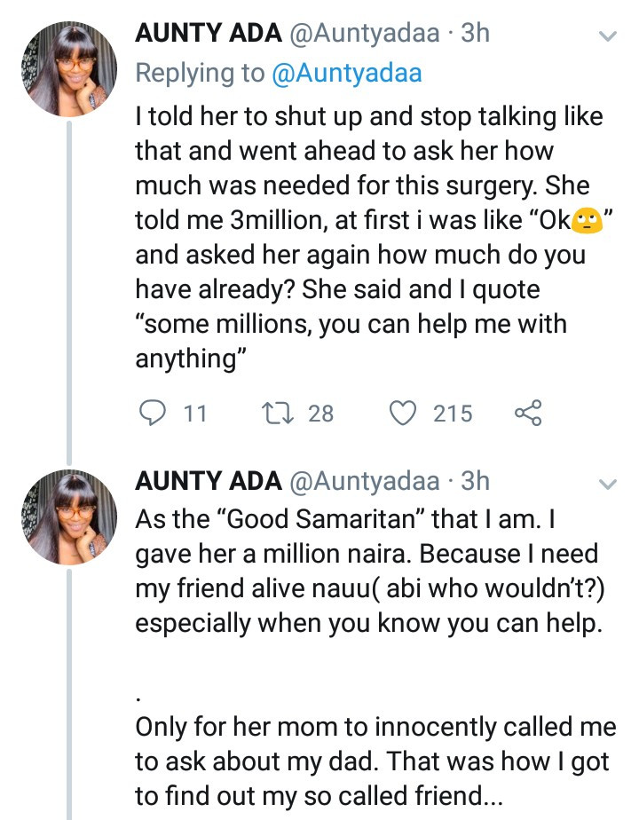 Ada noted that she gave the said friend a million naira from the proposed medical bill as she couldn’t afford three million at the time.