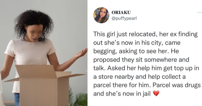 A lady has narrated how a young lady who recently relocated abroad landed in jail after helping her ex-boyfriend pick up a parcel.