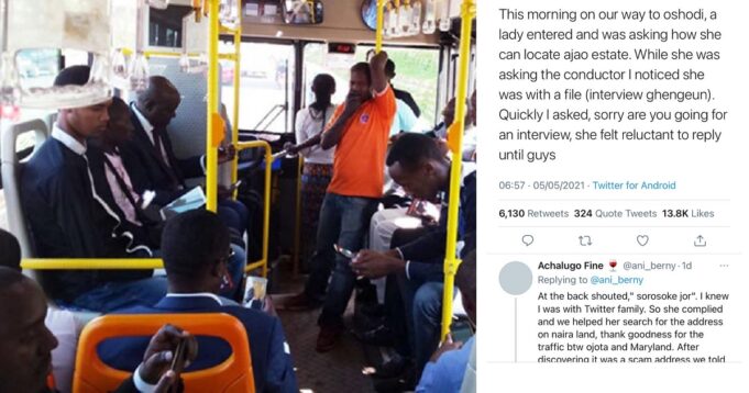 It turned out the address and company’s name is fake, and they all advised the young woman not to go to the venue. A passenger went as far as giving her 2,000 Naira to buy breakfast and return home.