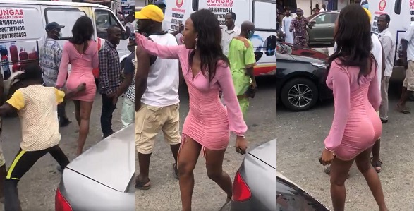 The lady who wore a pink body- con gown, was oblivious and was walking past the road, when a tout appeared from nowhere and hit her butt.