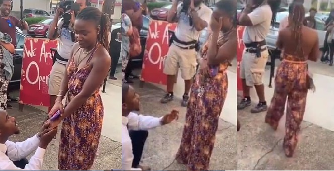 The young man decided to pop the ultimate question after he went down on one of his knees to propose to his girlfriend only for her to say “No”.