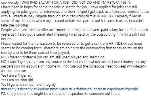 A honest Nigerian lady has returned money mistakenly paid into her account by a company she didn’t work for.
