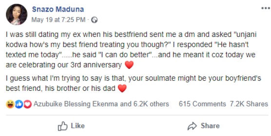 A South African lady who is celebrating her 3rd anniversary with her boyfriend made a damning revealation that he used to be her ex-boyfriend’s best friend before they began dating.