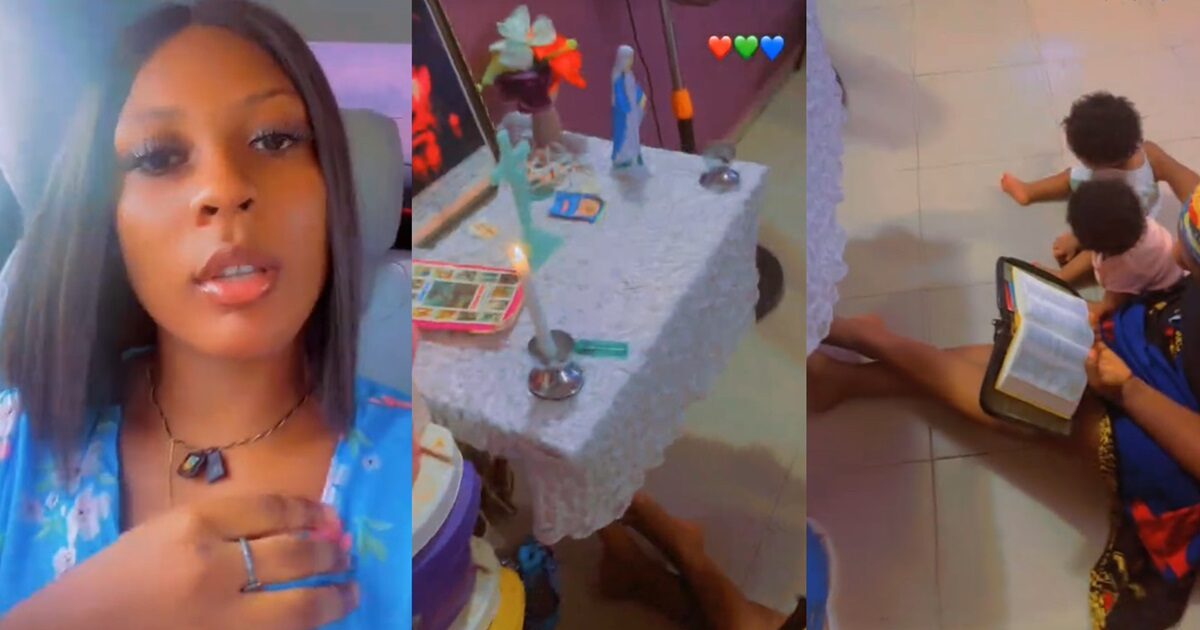 In a now-trending video a lady revealed that during a visit to her sister’s place, she was surprised to see the mother having devotion with her twins.