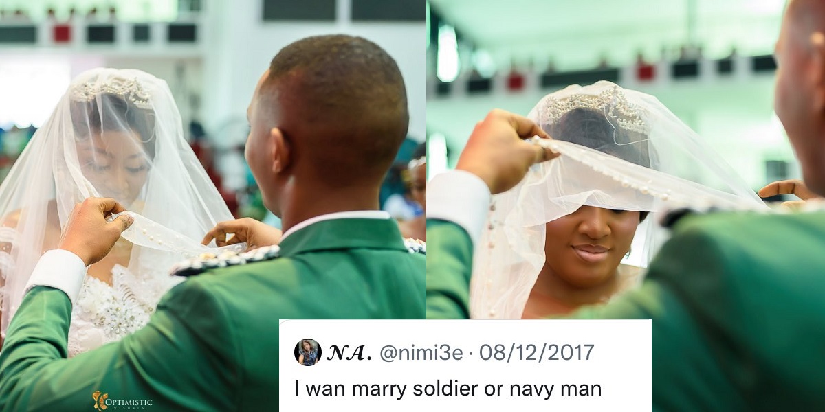 The bride, identified as @onimi3e on Twitter, had in a post on her page on December 8, 2017, shared her desire to marry someone in the military.