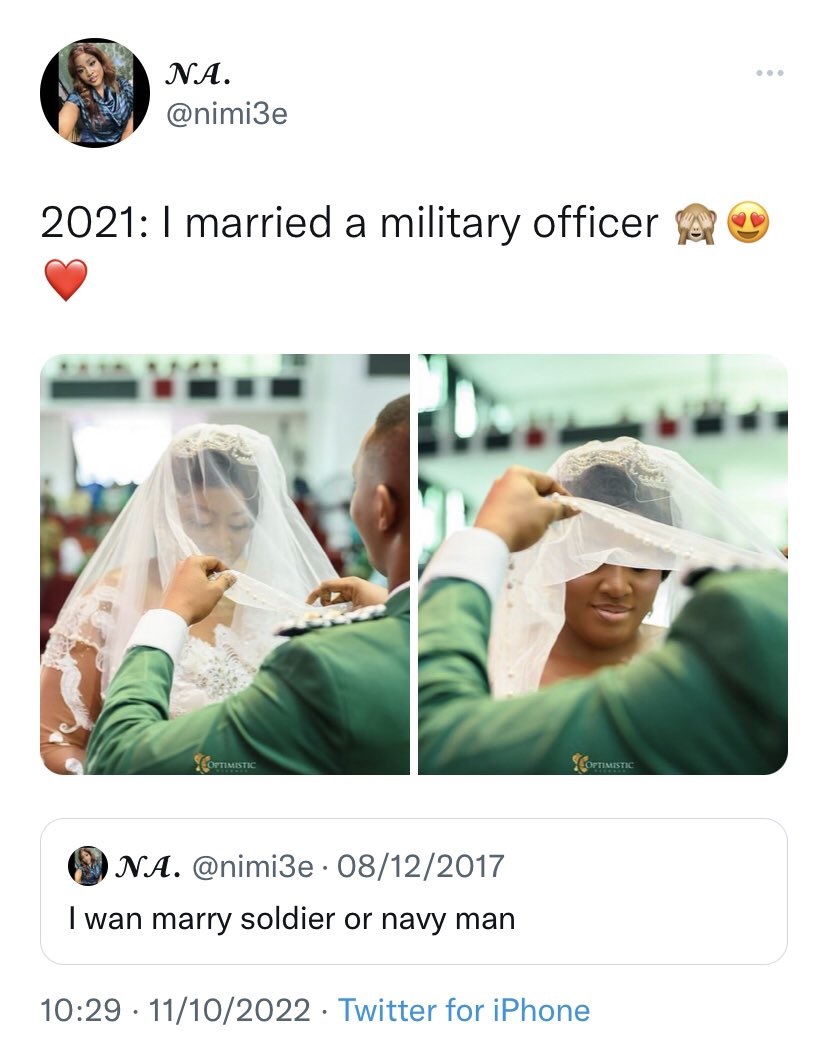 A Nigerian lady has tied the knot with a military officer, years after she causally spoke it into existence on Twitter.