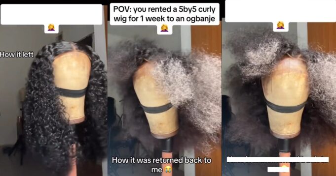 In the video which the vendor captions, “POV: you rented a 5by5 wig for one week to an ogbanje🤦♀️”, the wig was shown in all its glory before it was given to the rentee.