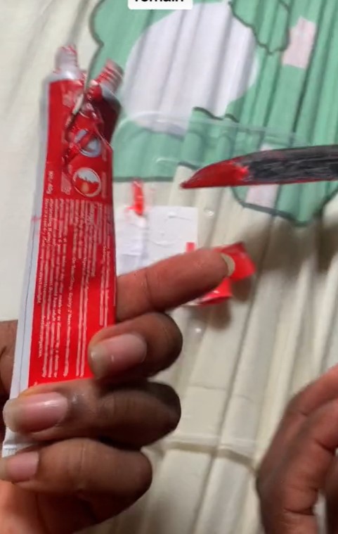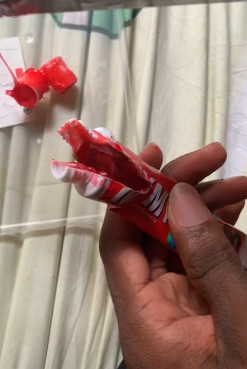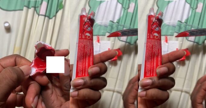 Nigerian lady shared on social media what she found inside a toothpaste tube. She was surprised at what she discovered after opening the tube.