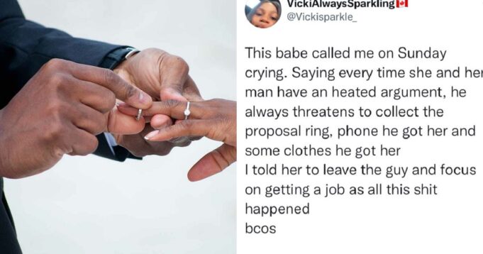 “This babe called me on Sunday crying. Saying every time she and her man have an heated argument, he always threatens to collect the proposal ring, phone he got her and some clothes he got her. I told her to leave the guy and focus on getting a job as all this shit happened bcos she depends entirely on the guy.