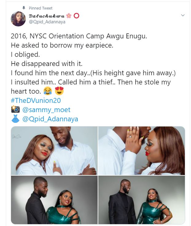 “2016, NYSC Orientation Camp Awgu Enugu.He asked to borrow my earpiece.I obliged. He disappeared with it.I found him the next day..(His height gave him away.)I insulted him.. Called him a thief.. Then he stole my heart too. #TheDVunion20”.