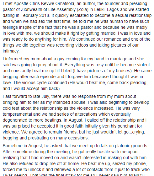 I met Apostle Chris Kevwe Omatsola, an author, the founder and presiding pastor of Zionwealth of Life Assembly (Zola) in Lekki, Lagos and we started dating in February 2018. It quickly escalated to become a sexual relationship and when we had sex the first time, he told me he was human to have such feelings inspite of the fact that he was a pastor and because he was madly in love with me, we should make it right by getting married. I was in love and was ready to do anything for him. We continued our romance and one of the things we did together was recording videos and taking pictures of our intimacy.