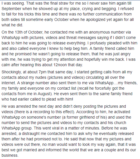 He was arrested the next day and didn’t deny posting the pictures and videos (there is a recording to this effect). According to him, he activated WhatsApp on someone’s number (a former girlfriend of his) and used the number to send the pictures and videos to my contacts and his church WhatsApp group. This went viral in a matter of minutes. Before he was arrested, a distraught me contacted him to ask why he eventually released them after he had promised not to. He said that now that my pictures and videos were out there, no man would want to look my way again, that it was best we got married and informed the world that we are a couple and its our business.