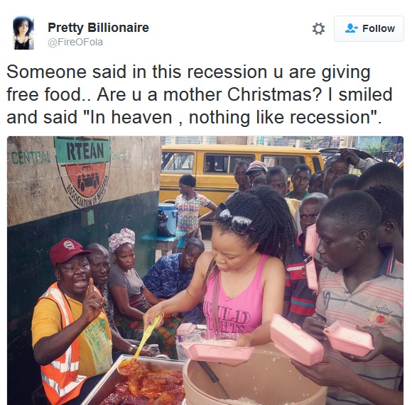 A Nigerian lady “Pretty Billionaire” on Twitter has for days now been trending on social media after a photo of her serving FREE meal to some residents in Lagos, went viral.