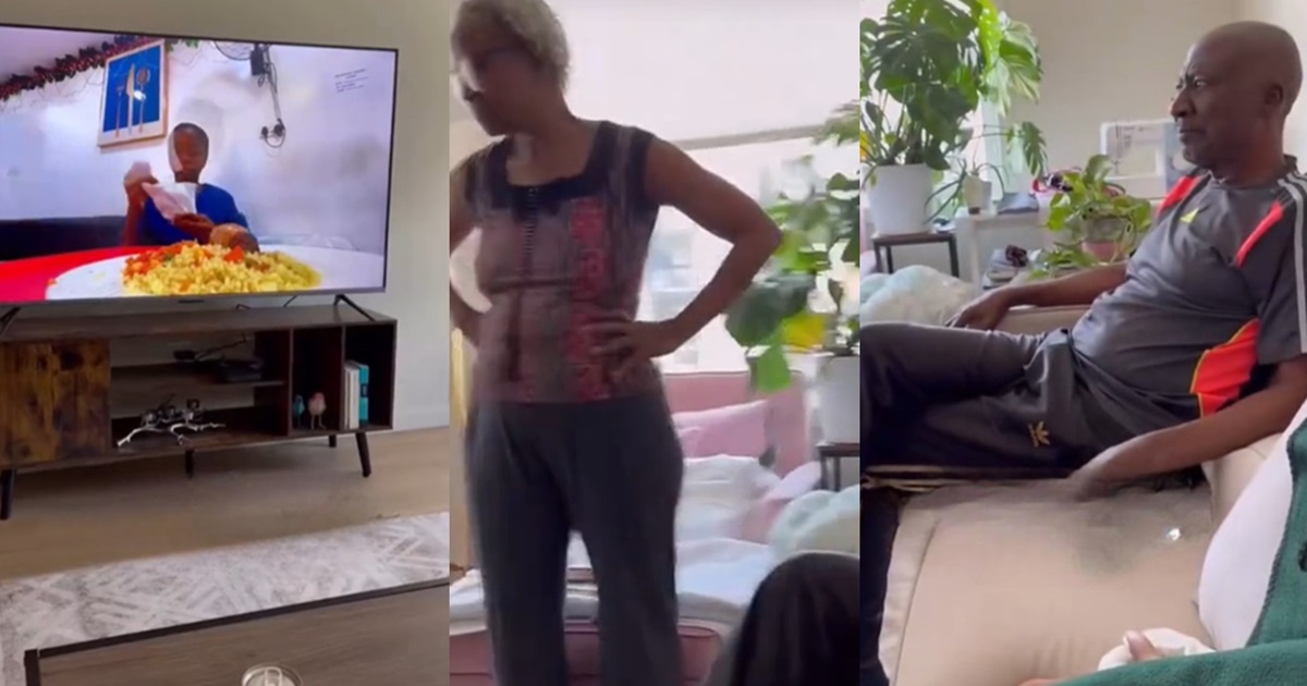 The mum stood with both hands holding her waist like every classical African mother, while her dad quietly sat with crossed legs, both completely engrossed in what they were watching.