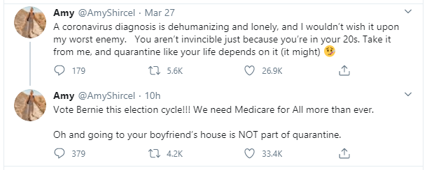 Vote Bernie this election cycle!!! We need Medicare for All more than ever. Oh and going to your boyfriend’s house is NOT part of quarantine.