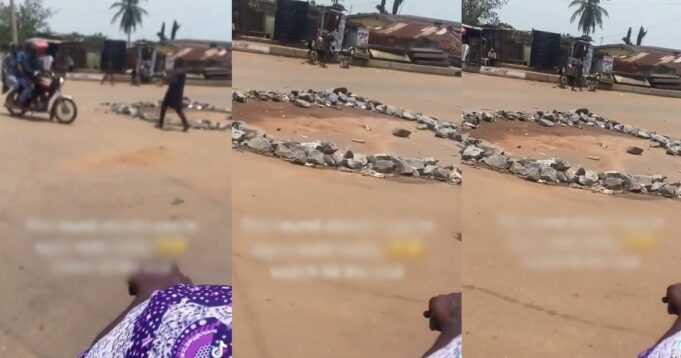 Although she did not specify the location in Ogun state, stones were stacked in circles to make a roundabout for automobiles in the video.