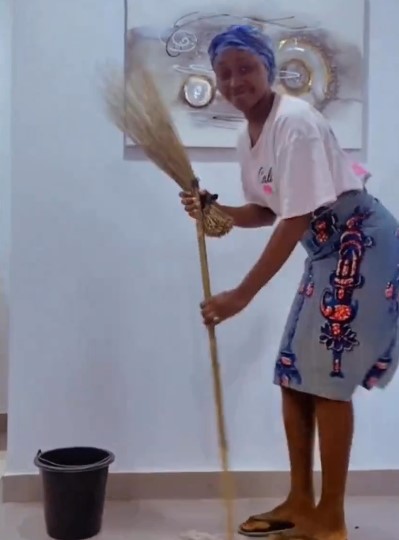 The video then transitions to one where she ties a wrapper around her waist and appears to be doing house chores and says that’s how she usually looks like in her mother’s house.