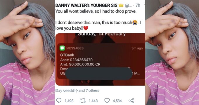 A Nigerian lady identified as Kaila Walterr on Twitter, has taken to the platform to flaunt the huge sum of money she allegedly received from her lover as Valentine’s gift.