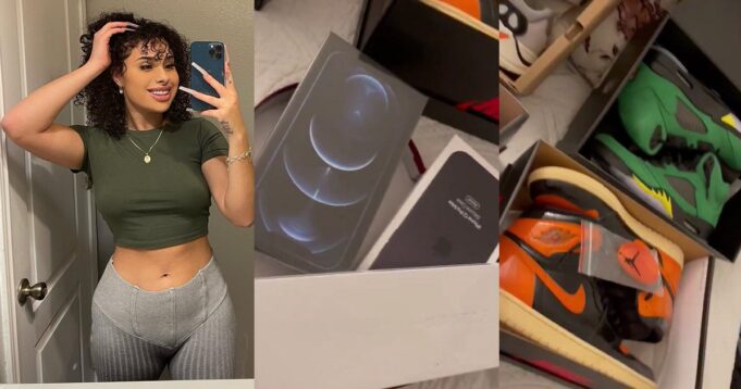 The lady with handle, @frostedaline bought a number of gift items like two iPhone 12 Pro Max, six sneakers, and personal hygienic items. Also, the young woman laid out some dollar bills together with the other gifts.
