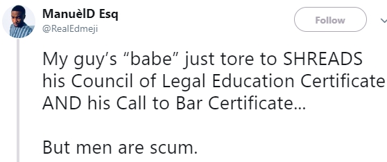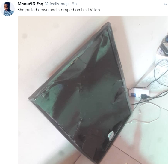 According to him, his friend’s girlfriend tore his council of legal education certificate and his call to bar certificate. She also ripped the television off the wall and stomped on it.