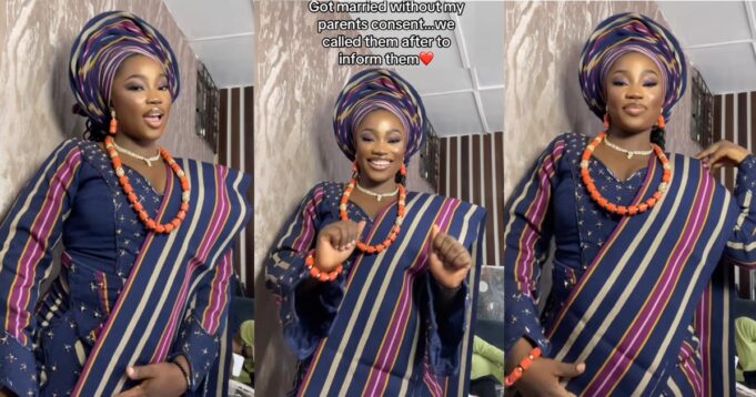 In a video she captioned, “Got married without my parents consent…we called them after to inform them”, the lady was ceremoniously dressed up for what would be her wedding.