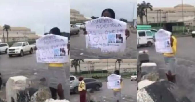 In a video serving rounds online the yet-to-be identified lady stood on a busy road carrying a placard that has her lovers full name and photo, while she pleaded with passerby to help beg him.