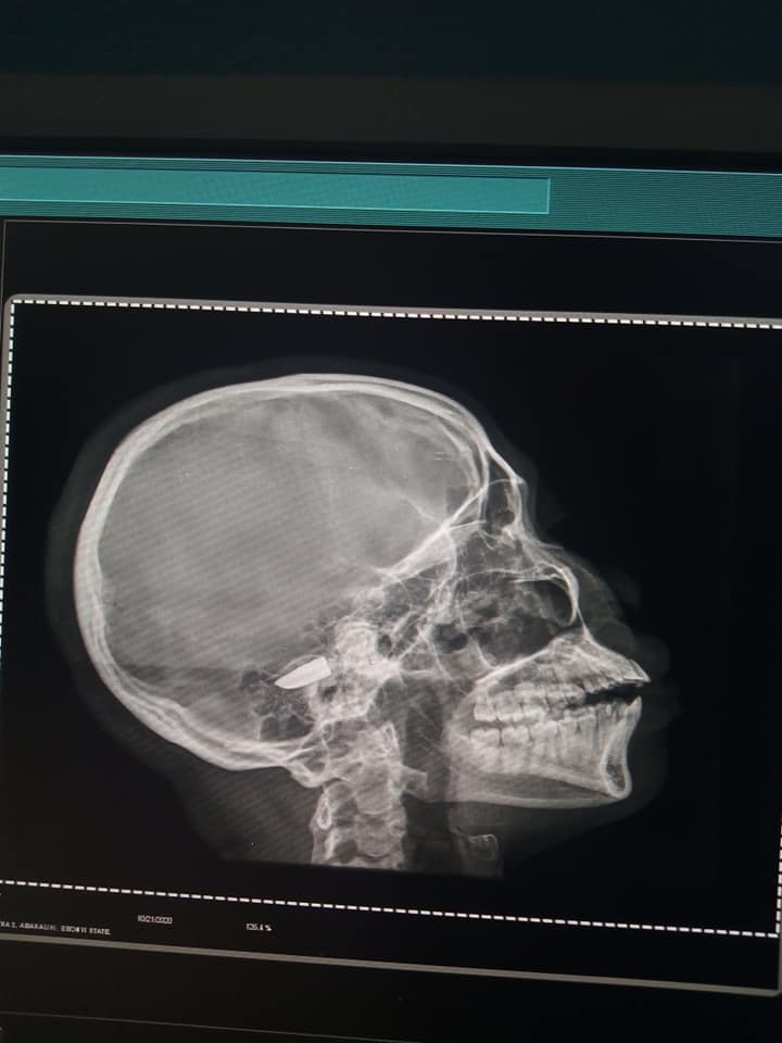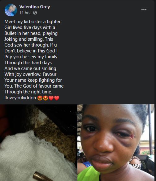 A Nigerian lady on Facebook with the username, Valentina Grey, took to her page to give the testimony of her sister, Favour, who survived having a bullet in her head for five days.