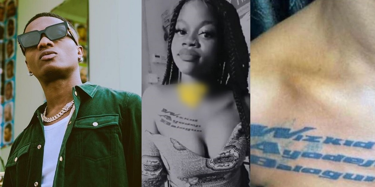 The lady in a video making the rounds online showed off the tattoo of the singer’s three names, “Wizkid Ayodeji Balogun,” boldly inked slightly above her right breast.