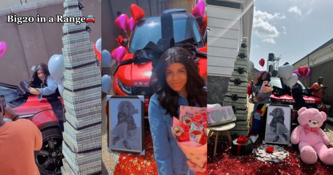 A red crimson red Range Rover SUV decorated with balloons and ribbons was parked in wait for the young lady who jumped with joy after she saw the exotic gift of hers.