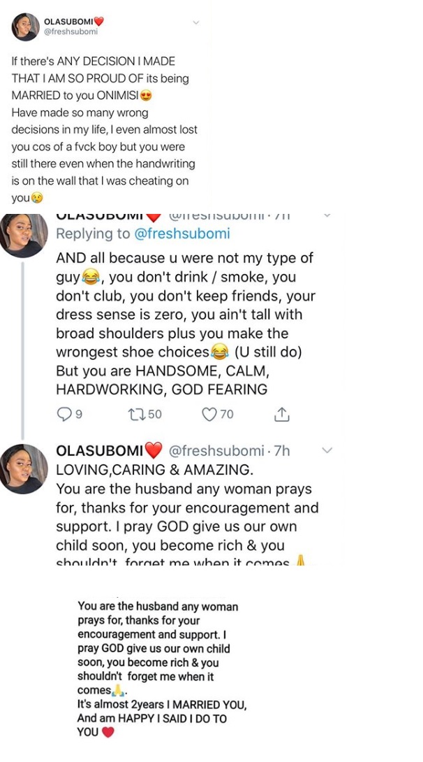 The lady with the handle @Freshsubomi revealed that her husband does not drink, party, keep friends, smoke, doesn’t have broad shoulders or fashion sense but he is handsome, calm, God fearing, hardworking and amazing.