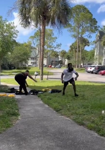 The enraged girlfriend was caught on camera throwing his clothes at him from a balcony as he struggled to defend himself.