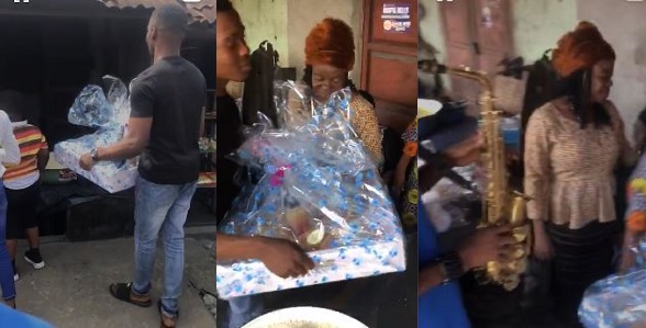 The lady, who went all out to make her mother’s day special within her budget, surprised her mum with a cake, food basket and a trumpeter played beautiful tunes.