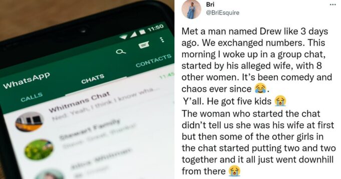 “Met a man named Drew like 3 days ago. We exchanged numbers. This morning I woke up in a group chat, started by his alleged wife, with 8 other women. It’s been comedy and chaos ever since 😂.